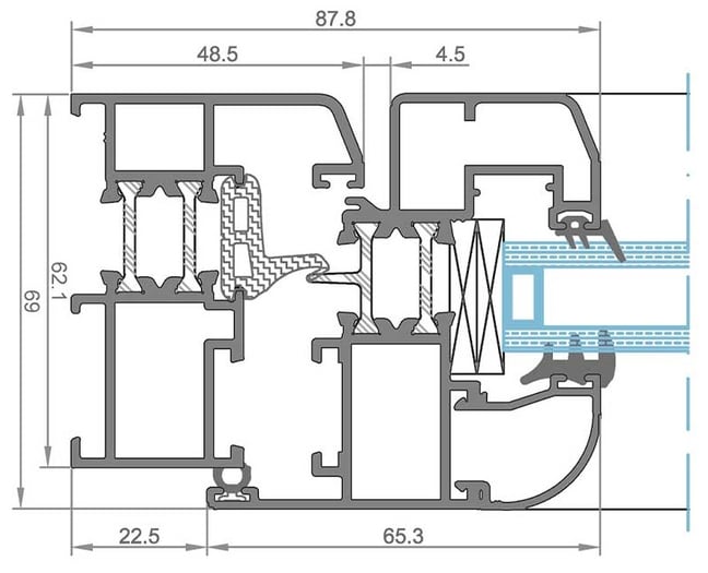 Secciones: Marco – 65.7 mm / Hoja – 75 mm